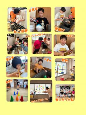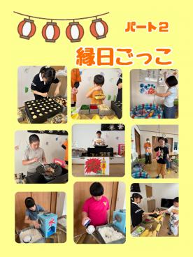 縁日ごっこパート2 今回の擬似体験は ・たこ焼き ・唐揚げ ・かき氷 かき氷は前回同様ティシュを 氷にみたてて行いました! たこ焼きは手作りたこ焼き機 の中にフェルトで作った たこ焼きを入れて串でクルクル 回してたこ焼きを作りました! お皿にたこ焼きを乗せて鰹節 紅生姜、海苔をパラパラと ふりかけて美味しそうな たこ焼きが完成しました! 唐揚げは中華鍋にお肉となる ガムテープを丸めた物を入れて 毛糸を切った唐揚げ粉を まぶして唐揚げを作りました! 上手に中華鍋を持って 唐揚げ粉をまぶしていました。 みんなしっかり本物みたいに 作ってくれました! お店屋さんが終わり次は お昼! お財布を持って順番に並び 社長さんが作ってくれた お弁当を買いました。 今回もお昼を食べている時は ほんと静かな子どもたちです! 午後はゲーム! ・射的 ・輪投げ ・魚釣り ・駄菓子屋 日々の活動で作ったお魚を 小さいプールに入れて魚釣り を楽しみました! 輪投げ、射的、駄菓子屋 と午後もたくさん遊び 美味しい本物のかき氷を食べ 縁日ごっこを楽しんだ 子どもたちです! ![]() ![]() |