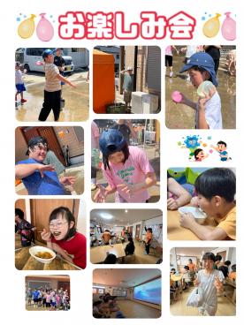 夏休みも今日で最後! みんなでお楽しみ会をしました! 午前中は水風船当てをしました! 2チームに分かれ足首につけた 的を狙って水風船当てがスタート しました! テントからひょっこり顔を 出して相手の様子を伺いながら 水風船を投げたり水風船が 飛んでくると当たらないように 足をあげたり 両チームとも 必死に投げ逃げてていました。 1回戦が終わると… みんなビッショリ!! 的も身体もびしょ濡れでした! 少し休憩してから2回戦!! お互い作戦を練ってスタート! ホースからのシャワーを 浴びながら水風船当てを 楽しみました! 暑い日でしたが水を浴びて とても気持ち良かったです! お昼は社長さんが作ってくれた カレーを食べました! 唐揚げ、ハンバーグが トッピングされていて 子どもたちの目は輝いて いました! いつものように静かにモリモリ 食べておかわりを待つ子ども たちでした! 午後は大スクリーンで 映画鑑賞をしました! 部屋を少し暗くして お部屋が映画館のように なりみんなワクワク! 集中してドラえもんの映画を 見ました! 夏休み最後みんな楽しかった かな(^∇^) ![]() |